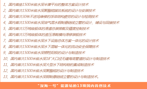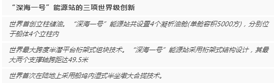 “深海一号”能源站由上部组块和船体两部分组成,按照“30年不回坞检修”的高质量设计标准建造,设计疲劳寿命达150年,可抵御百年一遇的超强台风。能源站搭载近200套关键油气处理设备,同时在全球首创半潜平台立柱储油,最大储油量近2万立方米,实现了凝析油生产、存储和外输一体化功能,具有较好的经济效益和技术优势。