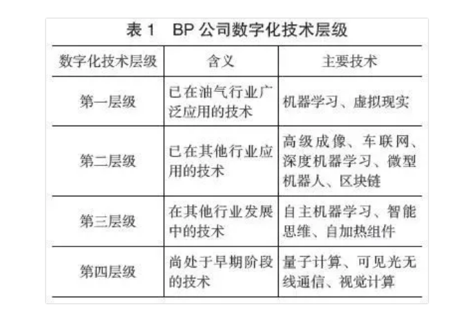 BP公司则将数字化技术分为4个层级:第一层级已在油气领域得到广泛应用;第二层级已在一些油气领域开始部署,有进一步扩大的潜力;第三层级是油气行业正在进行创新突破的领域;第四层级的数字技术还处于早期阶段,在未来具备很大潜力。各层级主要技术详见上图表1。
