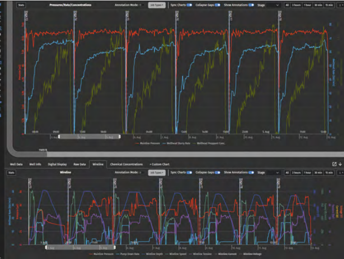 图3 借助自动化数据采集,完井团队能快速获取作业后数据(例如干线压力、井口砂浆流速、井口支撑剂浓度,以及各压裂段的测井参数),进而加快经验积累速度。在部分案例中,由此产生的洞察可帮助团队在不影响产量的前提下降低完井成本。
