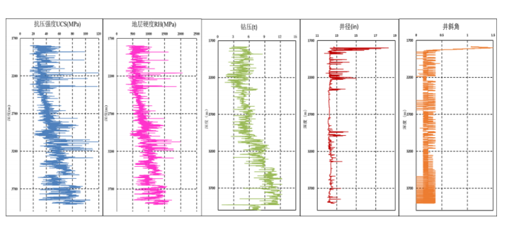 从抗钻特性参数曲线进一步分析,该区块地层抗压强度和硬度低,750m处有较硬夹层。从井径看,上部地层易扩径且扩径明显,井眼扩径可能减少扶正器作用,明显扩径时在井壁形成支点致井斜,上部井斜是硬夹层与扩径共同作用的结果;下部地层软硬互层,引发井斜持续波动。