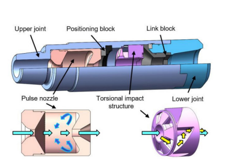 其工作流程清晰且高效:当钻井液进入脉冲喷嘴结构的腔体时,会触发自激振荡效应,产生主频大于 200Hz 的高频轴向冲击载荷;随后,振荡射流进入扭冲腔,冲击腔体内径向壁面,转化为高频扭转冲击载荷;最终,这两种复合冲击载荷通过下部接头传递至钻头,同时实现轴向和扭转方向的高频冲击,有效缓解粘滑现象,显著提升钻井速度。