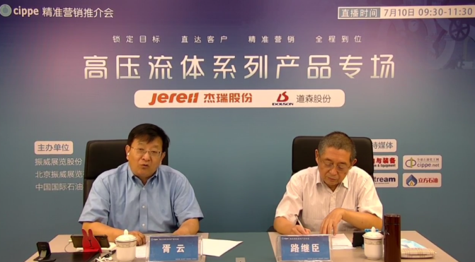 7月10日上午09:30-11:30,cippe精准营销推介会—高压流体系列产品专场准时开播。本次直播活动吸引了高压流体行业领军企业烟台杰瑞石油服务集团股份有限公司与苏州道森钻采设备股份有限公司莅临直播间。并邀请到院士专家进行在线解析行业发展趋势。活动受到行业的广泛关注与一致好评,认为cippe精准营销推介会为企业搭建了实现交易与品牌推广的线上平台。据后台统计数据显示,本次线上推介会吸引了超3.7万人次在线观看!仅直播时段的互动交流就达1557条。