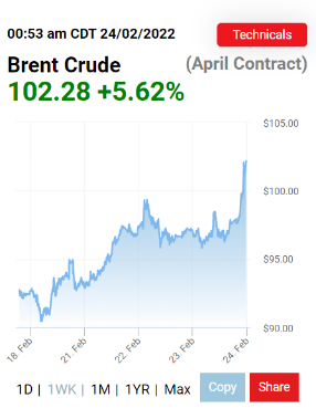 俄方宣布在顿巴斯地区开展特别军事行动后,由于对东欧出现全面冲突的担忧加剧,全球资本市场产生剧烈波动,国际油价持续走高,飙升至每桶100美元以上,为2014年以来首次。