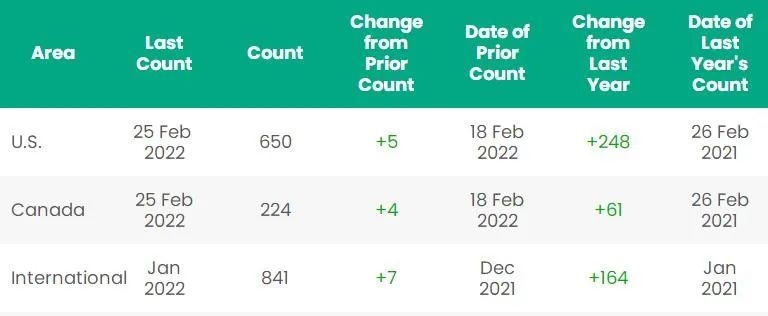 加拿大的钻机数量从去年的163台增加到61台,其中石油钻机增加46台,天然气钻机增加14台,其他钻机增加1台。