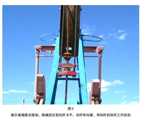 图2展示悬绳器支撑架、精确定位型光杆卡子、光杆导向罩、导向杆的协同工作状态