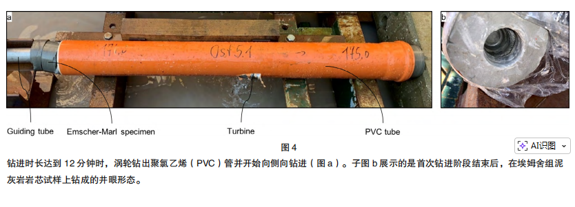 图4钻进时长达到12分钟时,涡轮钻出聚氯乙烯(PVC)管并开始向侧向钻进(图a)。子图b展示的是首次钻进阶段结束后,在埃姆舍组泥灰岩岩芯试样上钻成的井眼形态。
