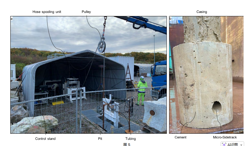 图5 包含现场作业全部拟用设备的立式试验装置(图a)。在由5.5英寸套管及环空注水泥构成的试样中钻成的微型侧钻分支井眼(图b)。