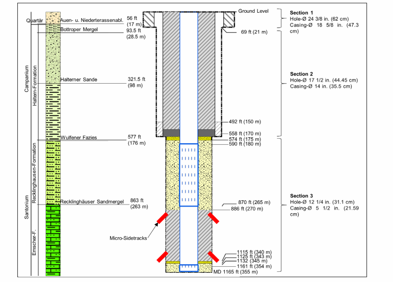 图1 德国马尔市 2 号井钻井设计与完井方案。图中蓝色条纹矩形代表滤水管井段,红色线条为微型侧钻分支井眼的布设位置(冯・克莱因佐根,2021)。