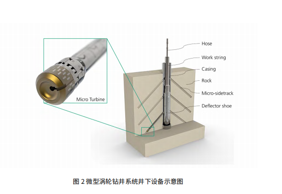 微型涡轮钻井技术可从主井筒向周围地层钻进额外的分支井眼,即所谓的微型分支井眼(见图2)。该技术的核心部件是一台由加压流体驱动的高转速微型涡轮。