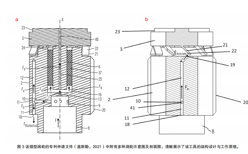 图3 该微型涡轮的专利申请文件(盖斯勒,2021)中附有多种涡轮示意图及剖面图,清晰展示了该工具的结构设计与工作原理。